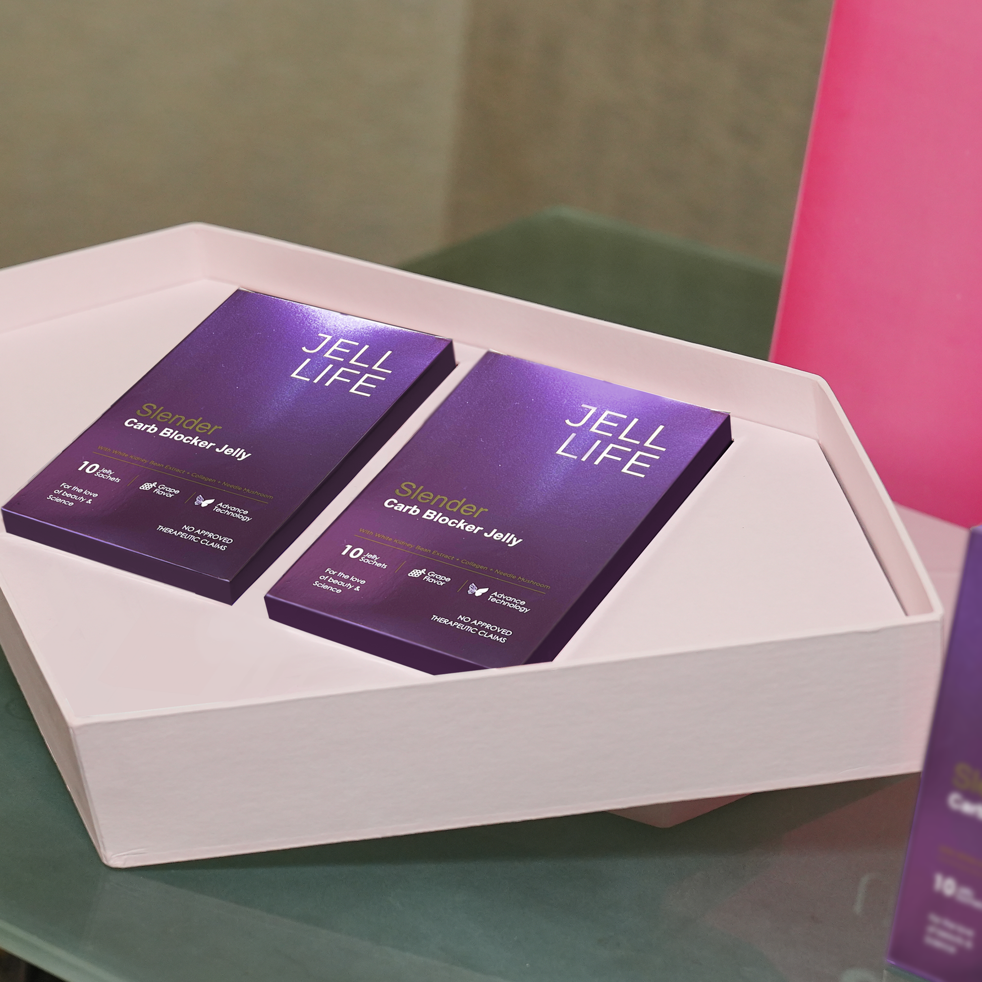 Enhance your vitality and anti-aging with our Diamond Gift Box Package! Indulge in Jell Life's timeless peach-flavored placenta anti-aging jelly, crafted with fish collagen, birds nest extract, sheep placenta extract, stevia, and vitamin C. For optimal weight management, try our grape-flavored Jell Life Slender Carb Blocker with fructo oligosaccharides, needles mushroom, white kidney bean extract, and stevia. Achieve health and radiance with our premium ingredients.