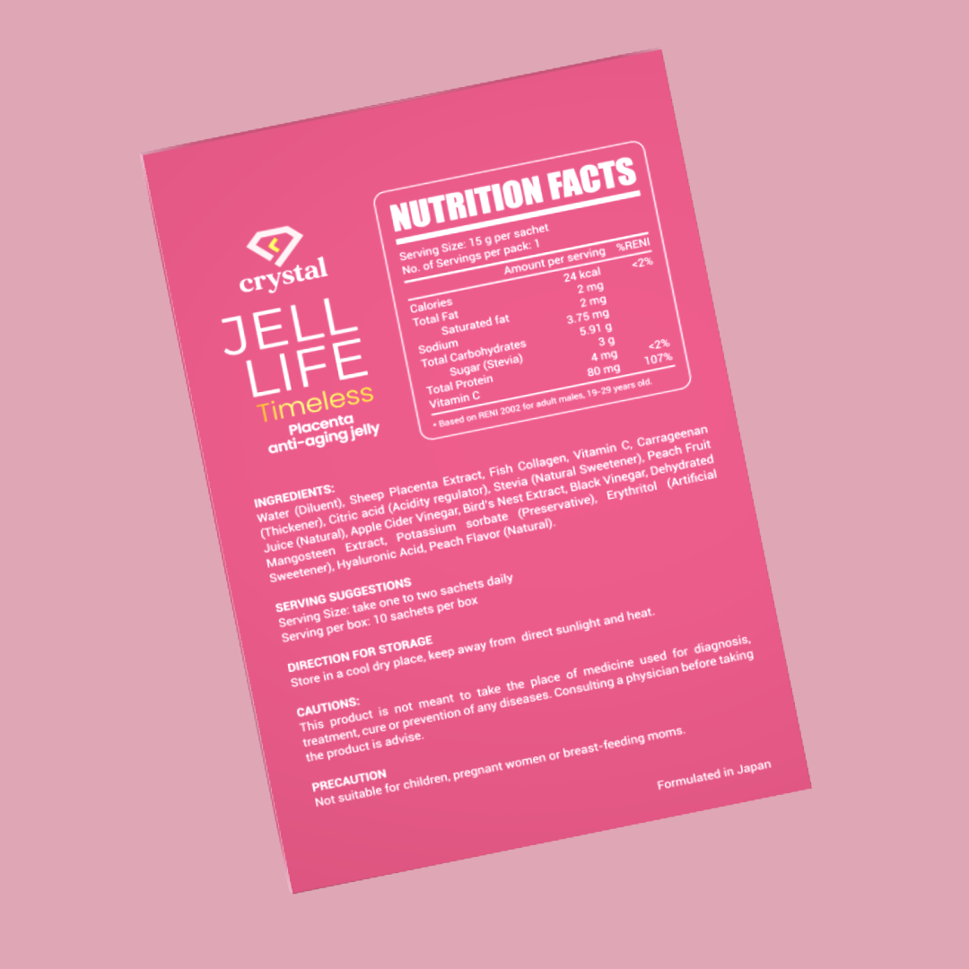 Experience the powerful anti-aging benefits of Jell Life Timeless Placenta Anti Aging Jelly. With potent ingredients like sheep placenta extract, birds nest extract, fish collagen, stevia, and vitamin c, this peach flavored jelly will leave you with radiant, youthful skin. See results for yourself.